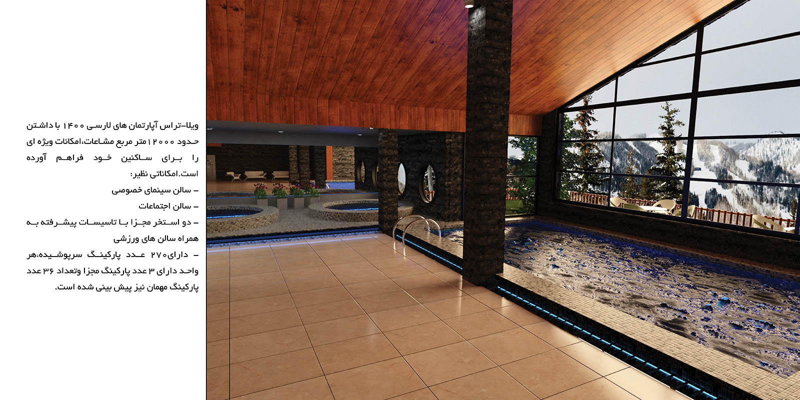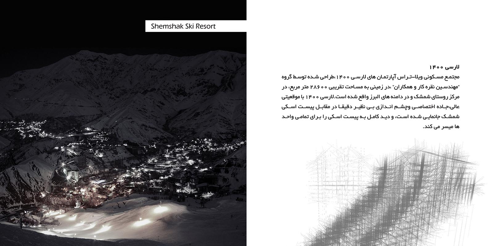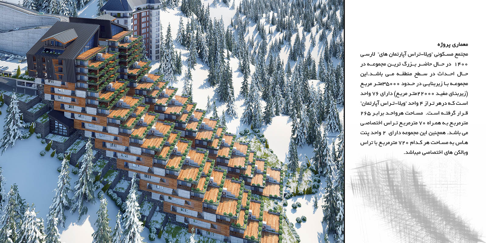Larci 1400 “Villa-Terrace Apartments” is a resort style residential project located in the resort city of Shemshak with superb view of famous “Shemshak ski slopes” and private road.