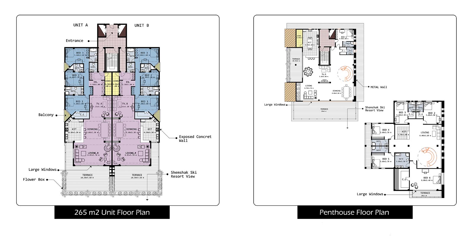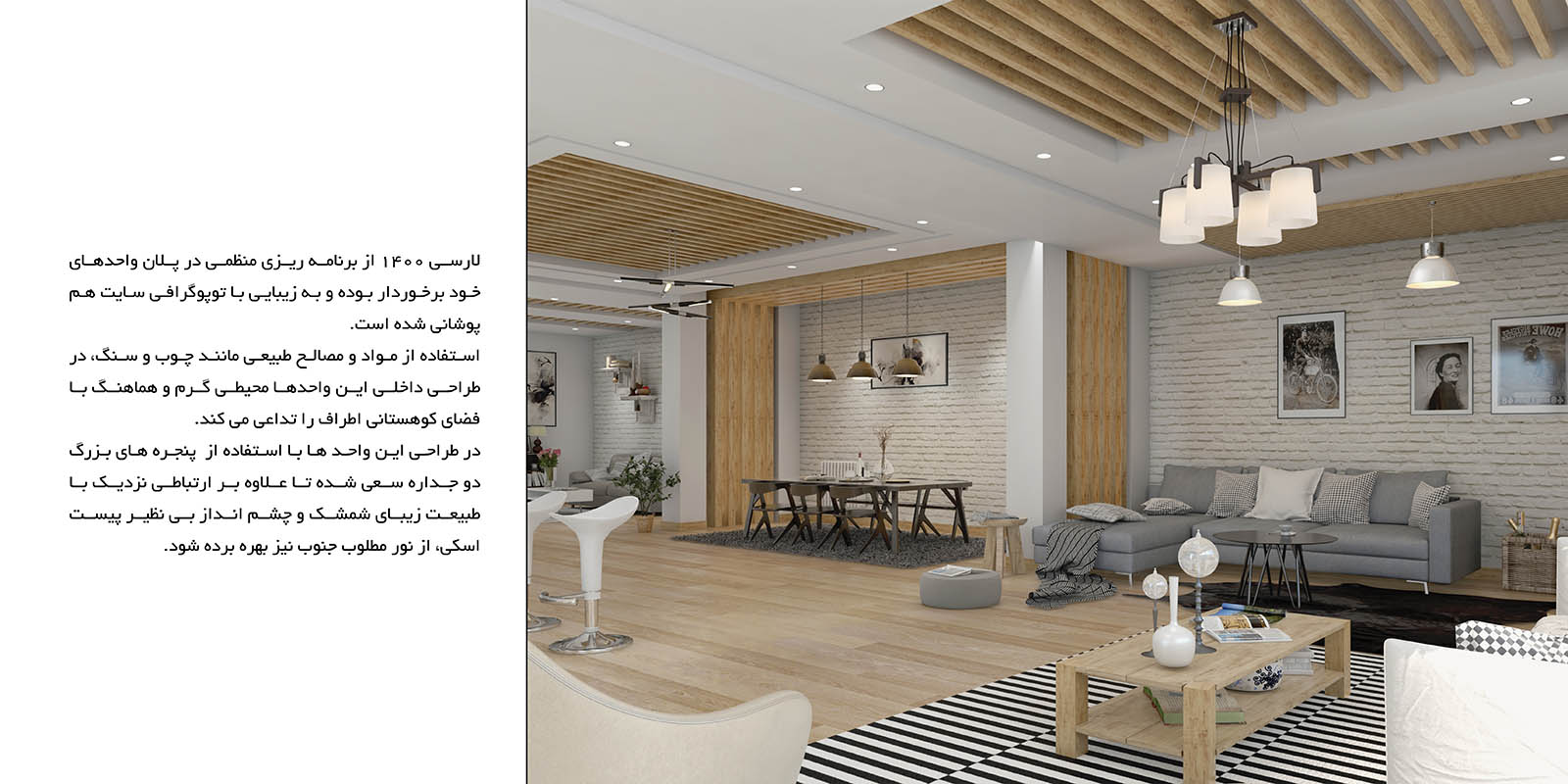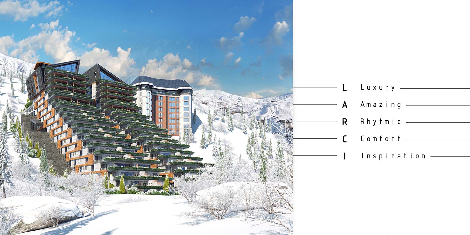 Larci 1400 “Villa-Terrace Apartments” is a resort style residential project located in the resort city of Shemshak with superb view of famous “Shemshak ski slopes” and private road.